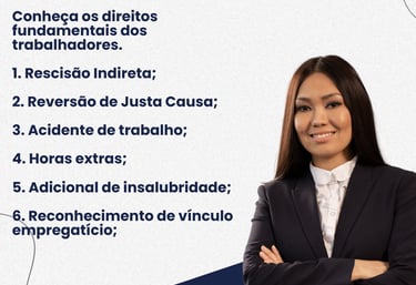 Defendemos seus direitos: Carteira de Trabalho não assinada, insalubridade e periculosidade, acidente de trabalho, demissão com ou sem justa causa, horas extras irregulares e rescisão indireta de contrato de trabalho.